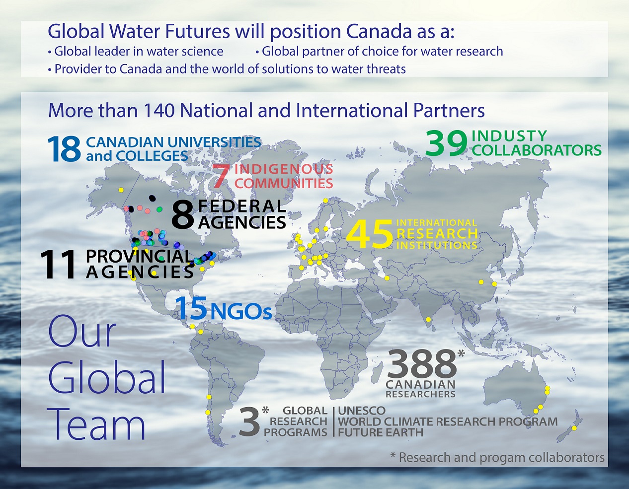 The Global Water Futures (GWF) project is led-by the University of Saskatchewan with support from 156 partners from the federal and provincial governments, academia, industry, international institutions, non-governmental organizations, and indigenous communities. GWF is a 7-year $143.7 million project primarily funded by the Canada First Research Excellence Fund, the Province of Saskatchewan, four institutional partners (University of Saskatchewan, University of Waterloo, McMaster University, and Wilfrid Laurier University), and industries.