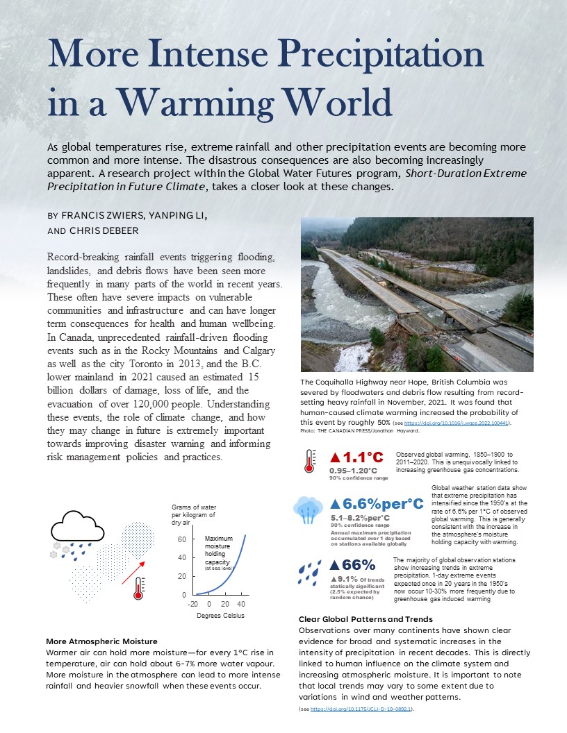 - Examination of projected changes in extreme precipitation, and methods for constraining those projections. A paper in Earth’s Future (https://doi.org/10.1029/2018EF001001) considers how big a sample should be in order to reliably estimate how extreme precip changes with warming. That was followed by a paper in GRL that considers how rarity affects the sensitivity of extreme precip to warming (generally, rarer events tend to intensify more rapidly with warming). Interestingly, in CanRCM4, intensification of rare events occurs at the Clausius-Clapeyron rate, and more frequent events, such as 5-year events) intensify a bit more slowly because of circulation related feedbacks that seem to suppress a full Clausius-Clapeyron response – see https://doi.org/10.1029/2019GL082908. A paper was published on precipitation change in CMIP6 models (https://doi.org/10.1175/JCLI-D-19-1013.1) that was used heavily in the IPCC AR6 WG1 report chapter on extremes (https://www.ipcc.ch/report/ar6/wg1/chapter/chapter-11/) and also provided material used in the summary for policy makers (https://www.ipcc.ch/report/ar6/wg1/chapter/summary-for-policymakers/). Here also, it was found that rarer events tend to intensify more rapidly than those that occur more frequently.
