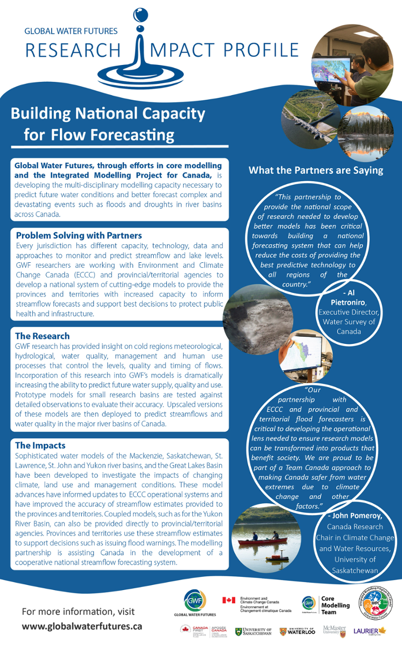 Global Water Futures, through efforts in core modelling and the Integrated Modelling Project for Canada, is developing the multi-disciplinary modelling capacity necessary to predict future water conditions and better forecast complex and devastating events such as floods and droughts in river basins across Canada.